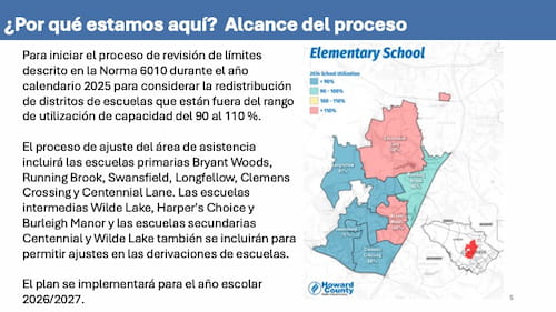El 13 de febrero del 2025, la Junta de Educación inició el proceso de revisión de límites descrito en la Norma 6010 durante el año calendario 2025 para abordar ciertas escuelas que se encuentran fuera del rango de utilización de la capacidad del 90 al 110 %. La revisión del ajuste del área de asistencia incluirá las escuelas primarias Bryant Woods, Running Brook, Swansfield, Longfellow, Clemens Crossing y Centennial Lane. Estas escuelas se encuentran por encima del umbral de utilización del 110 % o están adyacentes a aquellas escuelas y se utilizan por debajo del rango meta. Las escuelas intermedias Wilde Lake, Harper’s Choice y Burleigh Manor, y las escuelas secundarias Centennial y Wilde Lake también se incluirán para permitir ajustes en las derivaciones de escuelas. Un plan final para los ajustes de áreas de asistencia para el año escolar 2026-2027 se adoptará en noviembre del 2025.
